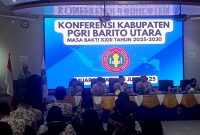 LAPORAN KEGIATAN KONFERENSI-Ketua Panitia Pelaksana Maxi Sumampow sampaikan laporannya pada Konferensi Kabupaten PGRI Barito Utara Masa Bakti 2025–2030, yang digelar di Aula Bappedalitbang Barito…