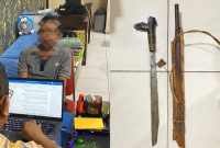 PELAKU PENGANCAMAN-Pelaku pengancaman karyawan perusahaan PT BBR, SA (62) bersama barang bukti sebilah parang beserta sarungnya diamankan di Mapolres Barito Utara. TEWENEWS, Muara Teweh…