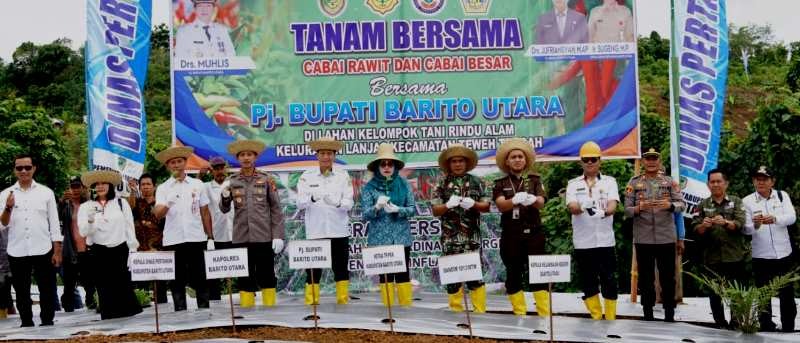 TANAM CABE BERSAMA-Pj Bupati Drs Muhlis bersama unsur FKPD dan kepala perangkat daerah, Camat Tengah, Kades Pendreh dan lainnya tanam cabe bersama di lahan kelompok tani Rindu Alam Dusun Bayas Kecamatan Teweh Tengah, Rabu (19/6/2024)
