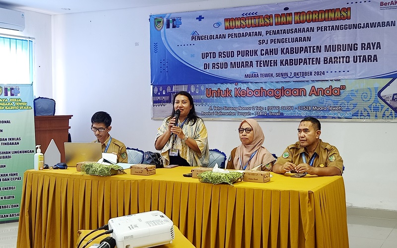 TEWENEWS, Muara Teweh – UPTD Rumah Sakit Umum Daerah (RSUD) Kabupaten Murung Raya (Mura) melaksanakan konsultasi dan koordinasi terkait pengelolaan pendapatan, penatausahaan pertanggungjawaban SPj Pengeluaran di RSUD Muara Teweh (Mtw) Kabupaten Barito Utara, di aula pertemuan RSUD lantai 2, Senin (7/10/2024).